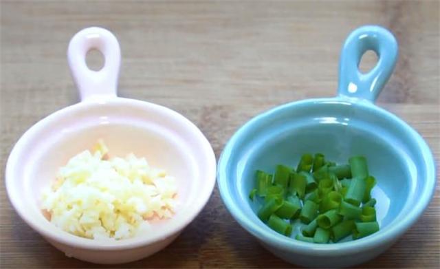 4.再準備兩瓣蒜和少許小蔥,將蒜切成末,小蔥切成蔥花,全部切完備用。