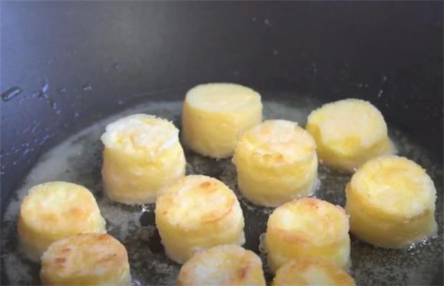 3.鍋內加入適量食用油,油熱之后放入玉子豆腐,全部放完以后轉小火煎一會兒,煎好一面后翻一個面,繼續用小火慢煎,煎至兩面都呈金黃色的時候就可以出鍋了,放在盤中備用。