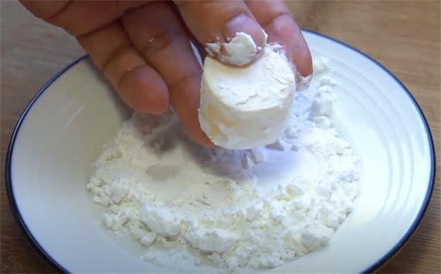 2.盤中加入適量的玉米淀粉,將玉子豆腐放在上面蘸滿淀粉,像這樣就可以了。