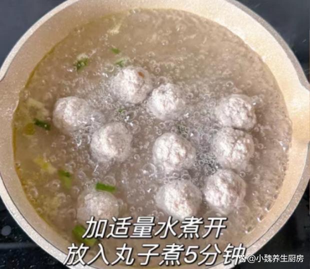 5:鍋中慢慢燒熱,調入少許植物油,放入蔥花和姜末,煸炒出香味,加上適量清水或開水煮沸,肉丸子全部下鍋,大概要煮5分鐘,肉丸子煸炒白色。
