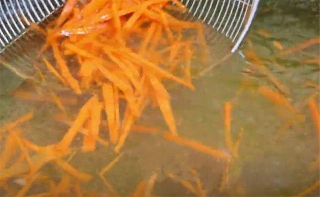 3.準備一根胡蘿卜先切片,再切成絲,把胡蘿卜也焯一下水,焯熟撈出,也過下涼水。
