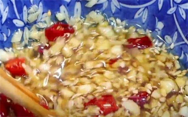 4.再準備幾瓣大蒜切片,再切碎放入碗里,再來兩個干辣椒剪成小段,放入一勺白芝麻,然后倒入燒好的熱油,激發出香味,加入一勺生抽,米醋,兩勺食用鹽,一勺白糖提鮮,再滴幾滴香油增香,用筷子充分攪拌均勻備用。