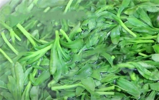 2.鍋內水燒開后,把養心菜放入鍋中焯一下水,焯水的時間不用太長,20秒就可以了,控水撈出過一下涼水,再控干水分備用。