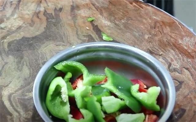 2.紅椒半個,切成滾刀塊,青椒半個,切成三角塊,切好以后和紅椒放在一起,用來配色。