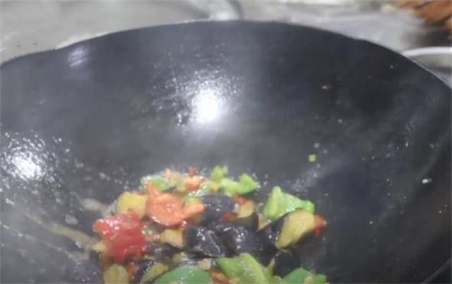 5.另起鍋加入少許食用油,倒入蒜末、蔥花和辣椒炒香,再加入5g素蠔油翻炒化開,倒入青紅椒塊,繼續翻炒幾下,再加入半勺清水,接著開始調味,加入3g食鹽,白糖1g提鮮,胡椒粉1g,味極鮮5g提味,翻炒化開之后倒入炸好的茄子,開大火快速翻炒片刻,勾入少許的水淀粉,這樣可以增加菜肴細膩的口感,再簡單翻炒幾下即可關火出鍋裝盤。