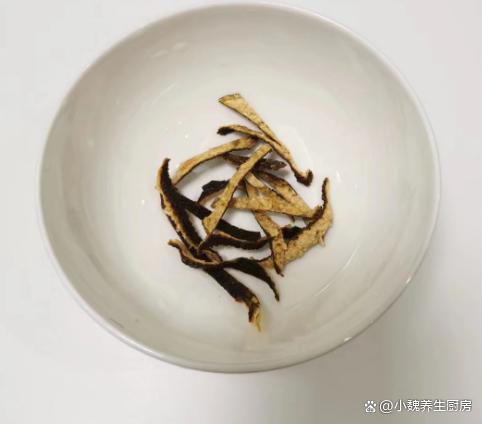步驟2:香芋的表面清洗干凈,用工具去掉外皮,切成若干滾刀塊,陳皮用溫水泡發,刮掉一些白色的物質,切成長條細絲,準備好香芋,紅豆和陳皮,開始制作這道陳皮香芋紅豆湯吧。