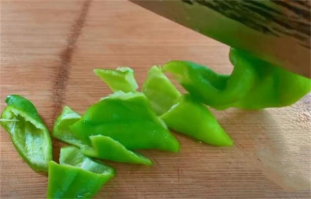 6.準備一根青椒,把它像這樣用刀切成塊,切好放入盤里。
