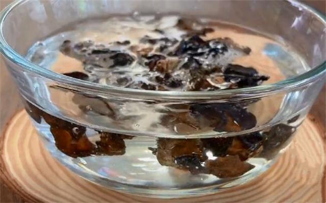 2.玉米筍全部收拾干凈以后,再準備點黑木耳,加入溫水把木耳泡發開。