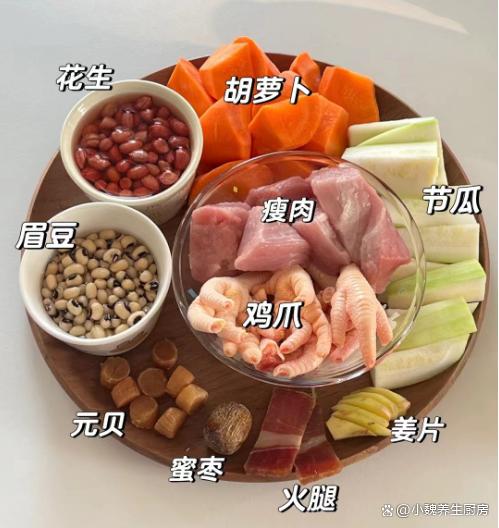 食材清單:挑選新鮮胡蘿卜一根,節瓜250克左右(節瓜是一種夏季的應季菜瓜,熱量非常低,富含豐富維生素和水分,非常適合來煲湯,湯汁鮮美又低脂),花生米80克左右,眉豆50克左右,幾個蜜棗,新鮮精瘦肉200克左右,選購150克雞爪(雞爪可以做成各種美食,還可以用來燉湯),生姜一大塊,火腿50克,純凈水足量,冷水若干,少許料酒,元貝30克,少許食鹽,一丟丟胡椒粉,其他調味品。