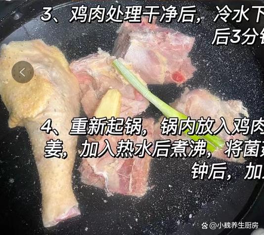 第五步:準備好一個湯鍋,鍋中放入一些雞肉,丟入姜片和蔥結,加上冷水沒過雞肉,還加上少許料酒,大火燉煮一會兒,逼出里面的血腥味,溫水沖洗掉浮沫,準備好這道玉米羊肚菌燉雞湯吧。