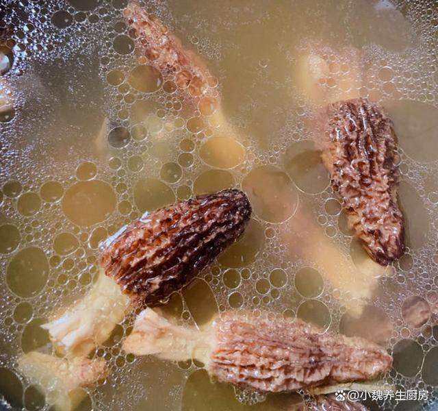 第七步:轉小火繼續燉一會兒,還可以加上一些枸杞子,出鍋前加上食鹽和胡椒粉調味,最后滴入香油,出鍋,這款玉米羊肚菌燉雞湯就可以食用了。