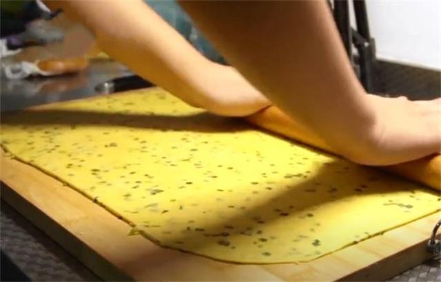 2.面團餳好之后,先按一按排排里面的空氣,搟面杖輕輕按壓搟成較薄的餅皮,餅皮越薄做出來的餅干越酥脆。