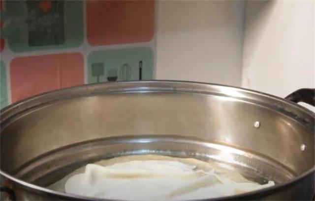 5.蒸屜中抹少許油,把餅皮放進去,鍋內上汽后開始蒸,這個水餅我們要一張一張的蒸,蒸第一張的時候,順便搟第二張的餅皮,然后再放入蒸屜,這樣才不會粘連,按照這個方法依次制作。