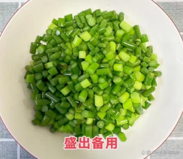 第三步:蒜苔的根部切掉,掐掉頂部的嫩尖,反復清洗干凈,切成若干小段,準備好腌制入味的肉丁和配菜,開始烹飪這道辣椒蒜苔炒肉丁吧。