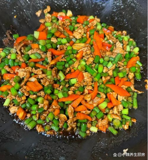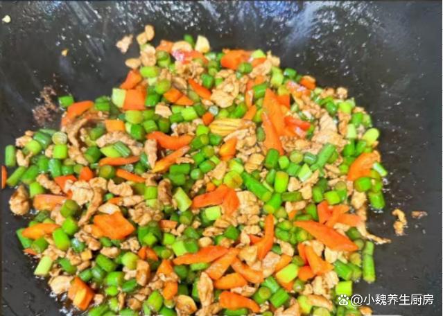 辣椒蒜苔炒肉丁是一道特別開胃的下飯菜肴,蒜苔聞起來很香,豬肉丁非常細嫩,菜色非常好看,香氣飄滿整個廚房,解饞開胃,出鍋后就被搶光了。
