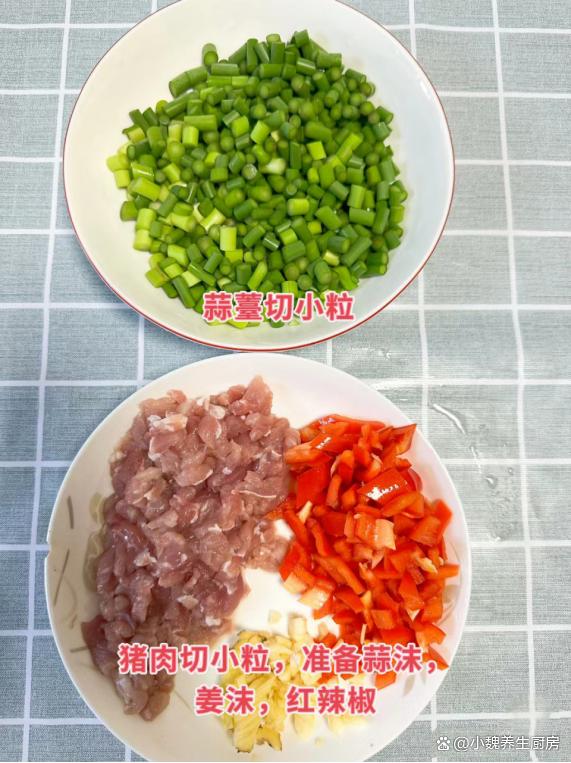 第一步:提前挑選好蒜苔,豬肉和辣椒,先把紅辣椒去掉蒂,去掉瓤和籽,洗凈切成小段,大蒜切成若干細末,生姜切成細末,備用。 第二步:提前把豬肉反復洗凈,瘦肉切成若干小丁,豬肉丁放在容器里,加上蔥姜水和少許料酒,加上生粉少許,調入食鹽和其他調味品,用筷子攪拌均勻,靜置20分鐘左右。