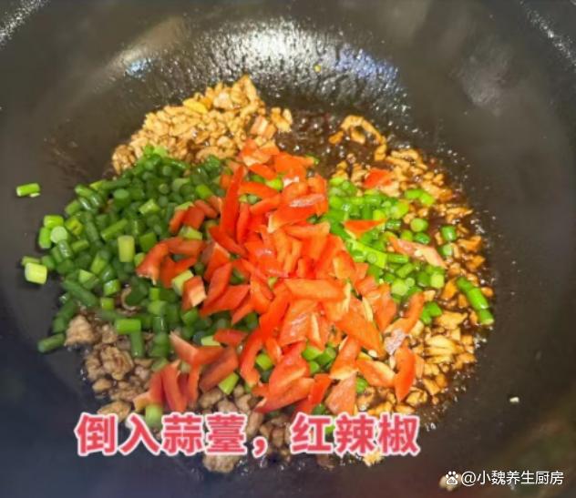 第五步:鍋底調入一丟丟植物油,讓油溫慢慢燒熱,加上姜蒜快速爆香,倒入豬肉丁大火快速爆炒,加上半勺料酒去腥,將豬肉炒至變色。