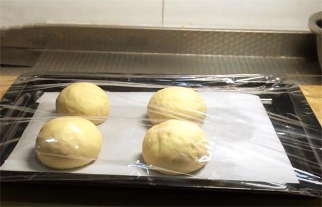 3.再次整理劑子的形狀,揉成一個個圓形的面胚,放入烤盤中蓋上保鮮膜松弛10分鐘。