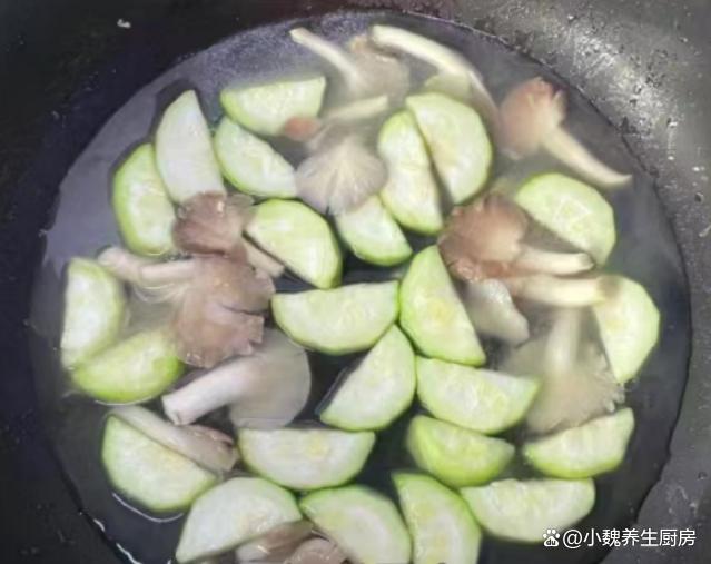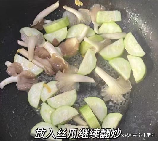 3:鍋中燒熱加上豬油,加上蔥白和姜末,倒入平菇和絲瓜,將兩者炒出水分來(lái),加上適量開(kāi)水煮幾分鐘。