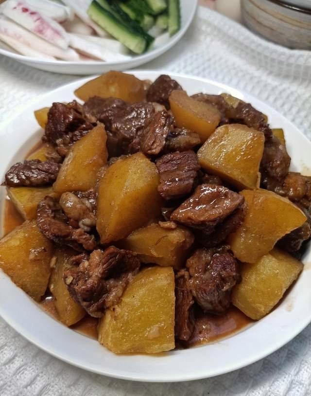 土豆燉牛肉 用料: 牛肉 500克、土豆 2個(gè)、姜片 適量、蔥段 適量、料酒 適量、食用油 適量、鹽 適量、八角 適量、花椒 適量、生抽 適量、老抽 適量、冰糖 適量 做法: 1. 牛肉切塊,焯水后撈出。 2. 土豆去皮,切塊備用。 3. 熱鍋涼油,放入八角和花椒煸香,加入姜片和蔥段煸炒出香味。 4. 放入焯水后的牛肉塊,加入適量的料酒,煸炒至牛肉變色。 5. 加入適量的生抽、老抽和冰糖,繼續(xù)煸炒均勻。 6. 加入適量的水,沒過牛肉,加蓋燉煮20分鐘左右。 7. 加入土豆塊,繼續(xù)燉煮30分鐘左右,直到土豆熟透、湯汁濃稠即可。 8. 加入適量的鹽調(diào)味,燉煮5分鐘即可。