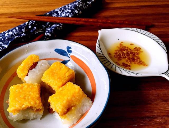 用料: 小米、糯米粉 200克、椰漿 200毫升、清水 200毫升、糖 70克、鹽 1/4茶匙、綠豆沙 適量、木糠適量 做法: 1.將小米、糯米粉、椰漿、清水、糖、鹽混合攪拌均勻,使其變成糊狀。 2.將糊狀物倒入鍋中,不停攪拌,用中小火煮至變成半透明狀。 3.將綠豆沙放入模具中,再將糯米糊倒入模具中。 4.用木糠撒在模具表面,然后用錫紙或保鮮膜蓋好,放入蒸鍋中蒸15-20分鐘。 5.取出涼糕,放涼后,用刀將其切成塊狀即可食用 |