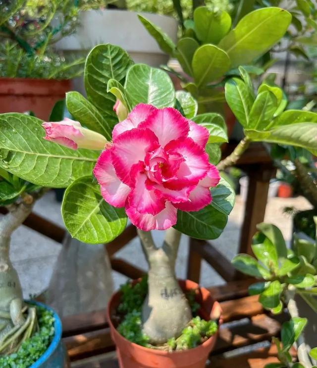 沙漠玫瑰也叫天寶花,花朵如玫瑰一樣艷麗,枝干粗壯肥大,儲存水分和養分的能力都非常突出,而且四季開花不斷,這一點更是令人驚喜。 沙漠玫瑰不需要花費過多時間去打理,尤其在澆水方面,少澆水,可以防止根系腐爛,控制枝葉的生長速度,從而促進多開花。而選花盆通也不會選擇特別大的,小盆擠著養有利于根系發育。 |