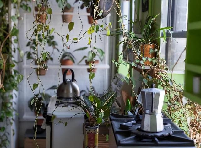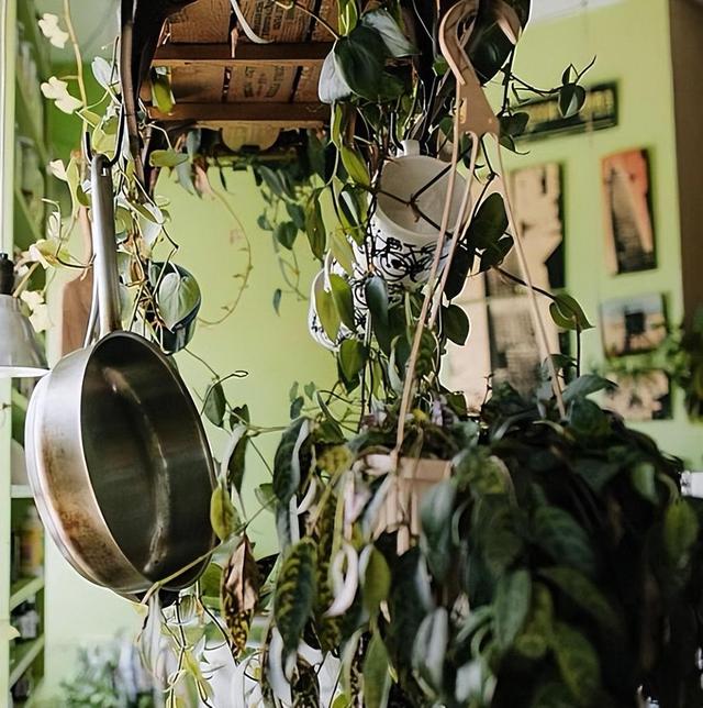窗戶、墻壁、地面、衣柜上,到處都是花草。 “我看著它們一天比一天更厲害。” 你瞧,那一盆盆植物,越纏越緊,藤條、樹枝、樹葉,從10尺高的屋頂上蜿蜒而下,像窗簾一樣掛在那里,這是一種怎樣的美妙經歷? 廚房中的鍋碗瓢盆,與四周的常青藤糾纏在一起,宛若一對恩愛的戀人。