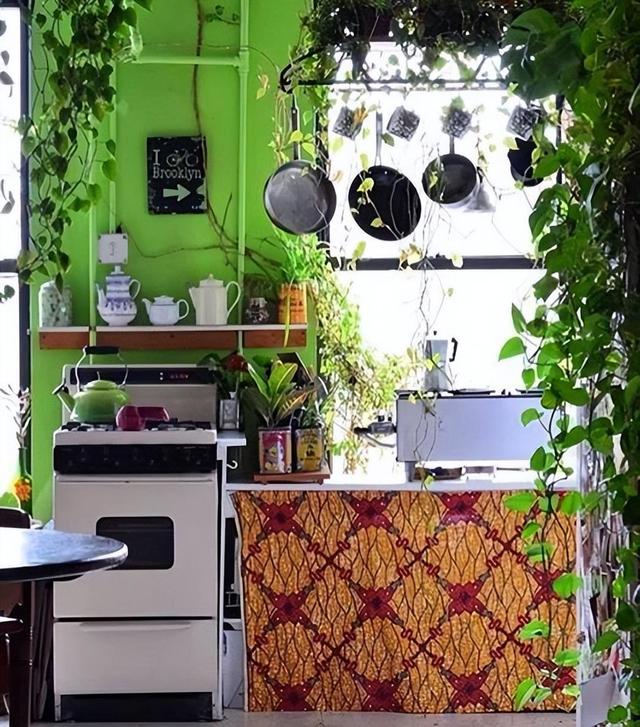 輕風吹拂著藤蔓,搖曳著,聞到了花朵和樹葉的香味,讓人情不自禁的想要躺下,想一想就覺得很美! 池子里有幾只空氣鳳梨,在水珠落下的瞬間,就開始搖晃起來。 廚房中的鍋子、攪拌器、爐子都被綠葉環繞著。