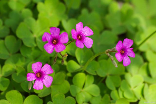 酢漿草是什么植物,酢漿草和三葉草有什么區別酢漿草是多年生的草本植物,明顯的整株有柔軟的小毛。莖葉有許多分支,掌狀葉片有3個小葉,呈倒心形。成熟時會有種子從蒴果彈出。 酢醬草的花語是——絕不拋棄你。 酢醬草的繁殖力很強,就如同它的花語:絕不拋棄你。不論是來自庭園、路旁、安全島、荒地或花盆、花圃,處處可見它成群繁生,其野性之強。