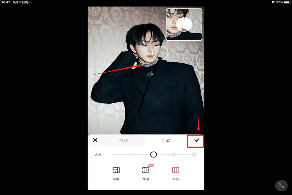 3、點擊【瘦臉瘦身】,并且選擇手動模式,根據需要選擇筆觸大小。