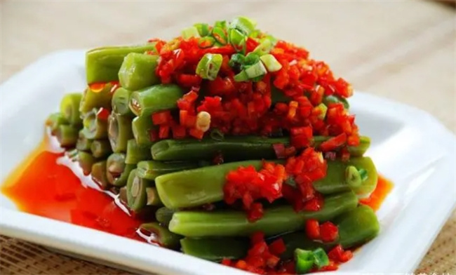 NO.4 涼拌四季豆 準備食材如下:四季豆200克,紅椒1個,色拉油2小匙,食鹽1小匙,蒜4瓣,生抽1小匙,香油1/2大匙,白醋1/2大匙,白砂糖1/2大匙 具體做法如下:將四季豆兩端的較老的角擇凈,放入淡鹽水中浸泡10分鐘,再洗凈備用,鍋內放入半鍋水,加入沙拉油(欖橄油)1小匙、鹽1/2小匙,水開后放入四季豆,開蓋中火煮2分鐘至熟(豆角表面轉為深色),將豆角浸入冰開水或冷開水中至完全冷卻,將豆角瀝凈水份,切成長段。紅椒切絲,大蒜剁成蓉,將豆角放入碗內,放入紅椒絲,大蒜,鹽,生抽,白醋,砂糖,沙拉油及芝麻香油拌勻,放置10分鐘入味后即可食用!