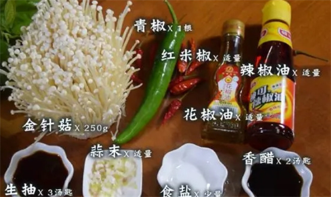 首先準備食材: 金針菇 X 250g 生抽 X 3湯匙 食鹽 X 1茶匙 香醋 X 2湯匙 花椒油 X 2湯匙 辣椒油 X 2湯匙 青紅椒,蒜末 X 適量(詳細用量請看內文的使用操作過程)
