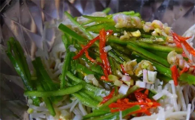 接下來,我們切配料,這個配料不多,就青椒和小米椒,先把辣椒去蒂,然后切開,再取出辣椒籽,最后切成絲,盛出放著備用!(辣椒絲在這道菜里面,雖然不是主要食材,但也有著非常重要的意義,不但可以增加香辣味,青紅椒絲還能夠增加鮮艷的顏色對比,使整道菜看起來五彩繽紛,更加的有食欲) 食材處理好之后,我們開始進入制作階段,起鍋加入大量的清水,然后大火煮沸,水煮沸之后,加入1小勺的食油,再把撕碎的金針菇放到鍋里焯水,等到鍋里的水再次煮沸后,再煮2分鐘后,即可撈起瀝干水分,裝盤備用!(這里說明一下:焯水的時候,如果放入食油,可以最大程度的使焯過水的金針菇,保持原有的色澤!)