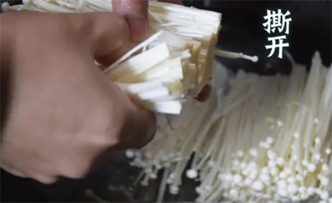 食材準備好之后,我們先來處理食材,把買來的金針菇洗凈,洗凈之后,放在菜板上,切去金針菇的根部,然后用手把金針菇撕開成小條,重復操作,直到把所有的金針菇都撕完,然后放著備用!