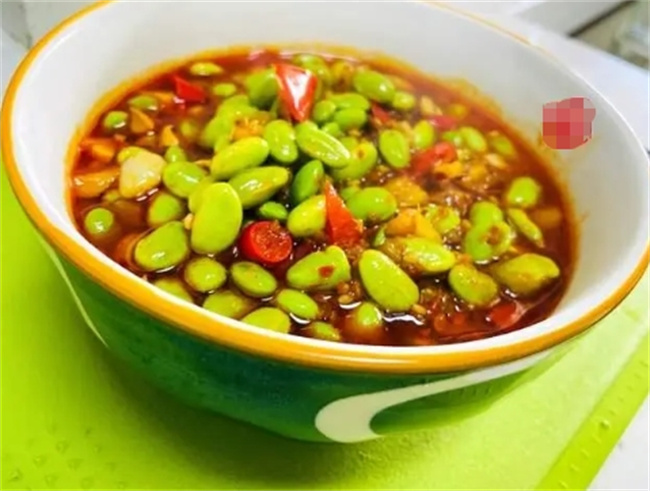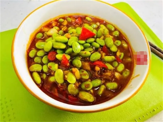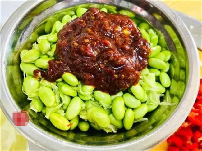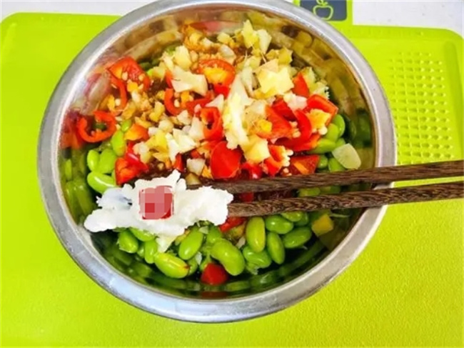 毛豆米放到小盤子里,加一點豆瓣醬,食用油,蒜泥,紅尖椒,這個時候是不需要拌均勻的。直接把所有食材放上面就可以了。