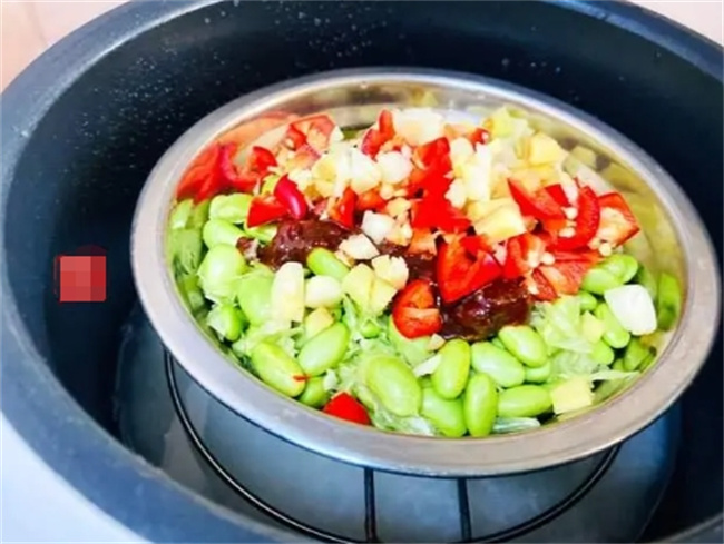 把準備好的盆子直接放到電飯鍋里,跟米一同下鍋,按下煮飯鍵,就直接等著飯好就行了。