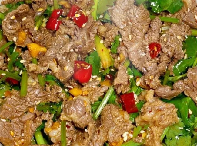 食材準備:豆角、五花肉、小米辣、蒜末。 做法流程: 1.豆角清洗干凈,然后切成小段備用,接著起鍋燒水,水燒開之后,加入適量的食鹽和花生油提鮮,再倒入豆角焯煮三分鐘,然后撈出瀝干水分備用。 2.清洗干凈五花肉,然后起鍋燒油,油熱以后,放入五花肉煸炒,煸炒出多余的油脂后,再加入蒜末和小米辣翻炒均勻,炒出香味。 3.接著加入適量的生抽、料酒和蠔油調(diào)味上色,繼續(xù)翻炒均勻,然后再倒入焯好的豆角一起翻炒。 4.最后淋入少量蠔油和白糖提鮮,繼續(xù)翻炒均勻入味,即可出鍋開吃。 五、香菜拌牛肉