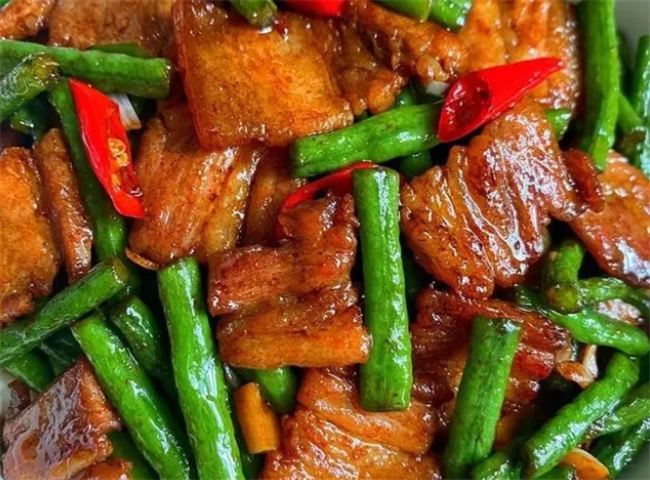 食材準備:魷魚、洋蔥、芹菜、小米辣、姜蒜末、姜片。 做法流程: 1.魷魚清洗干凈,然后改花刀切好,接著起鍋燒水,水燒開之后,放入姜片和里面料酒去腥,再倒入魷魚焯煮一分鐘,然后撈出瀝干水分備用。 2.切好芹菜、洋蔥絲、姜蒜末、小米辣,然后熱鍋燒油,油熱以后,倒入姜蒜末爆香,接著倒入魷魚大火翻炒,淋入適量的料酒和生抽調(diào)味去腥,繼續(xù)翻炒。 3.炒出香味以后,再倒入小米辣、芹菜、洋蔥絲繼續(xù)大火爆炒,加入適量的食鹽、生抽、蠔油和白糖調(diào)味提鮮,淋入少量清水,繼續(xù)大火爆炒。 4.炒至配菜斷生入味后,即可出鍋開吃。 四、豆角炒五花肉