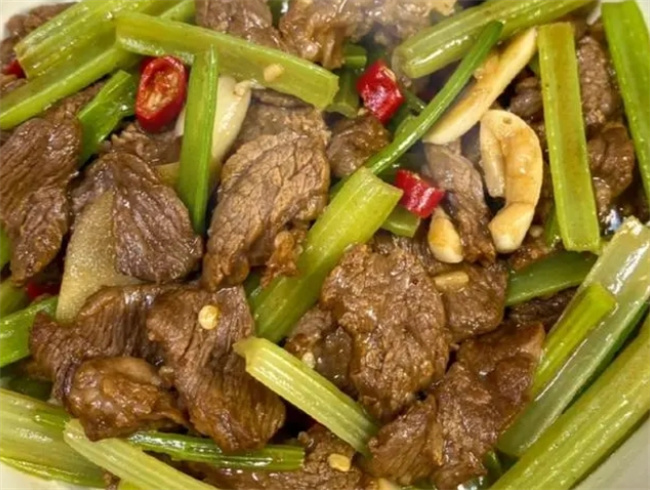 食材準備:牛肉、香菜、蒜末、小米辣、白芝麻、辣椒面。 做法流程: 1.牛肉清洗干凈,然后切成薄片,接著加入適量的淀粉、食鹽和花生油,一起抓拌均勻,腌制20分鐘備用。 2.起鍋燒水,水燒開之后,放入腌制好的牛肉焯煮至變色熟透后,再撈出瀝干水分,放入大碗中,接著清洗干凈香菜,然后切成小段,也放入大碗中備用。 3.切好蒜末和小米辣,然后和辣椒面、白芝麻一起放入另一個碗中,接著淋入熱油爆香,再加入一勺生抽、一勺香醋、一勺蠔油和半勺白糖,一起攪拌均勻備用。 4.最后將調(diào)好的醬汁淋入大碗中,再和牛肉、香菜一起抓拌均勻,即可開吃。 六、芹菜炒牛肉