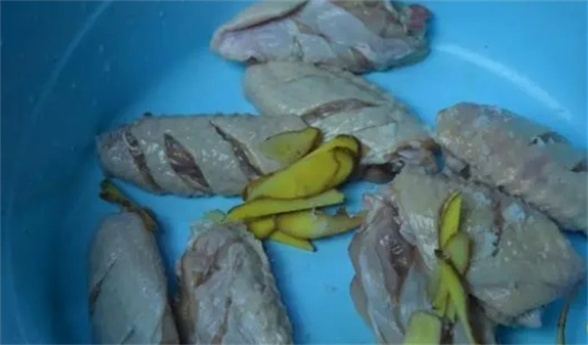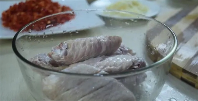 第三步:等雞翅泡好之后,倒掉泡雞翅的水,然后再清洗干凈,接著擰干雞翅上面的水分,或者用廚房紙巾吸一下水,吸干水分之后,放入盆中,加入1茶匙食鹽,加入幾個姜片,然后抓勻,腌制10分鐘入底味!
