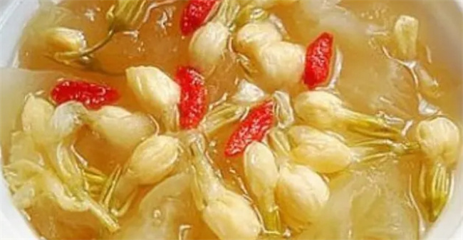 做法2:茉莉花酒糟羹 準備食材如下:茉莉花5克,醪糟300克,荸薺4個,蜂蜜適量 具體做法如下:荸薺洗凈,去皮,切片,干茉莉花洗凈,放入鍋中,加適量水煮開,放入荸薺片和醪糟,然后再煮10分鐘即可,吃的時候把茉莉花撈出來,調(diào)入糖或蜂蜜即可!