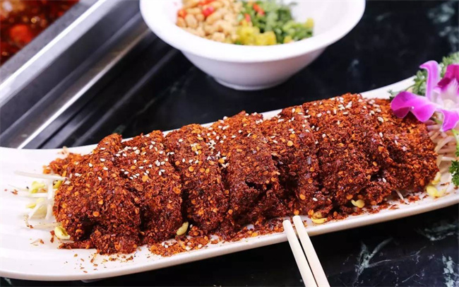 制作步驟: 1. 需要一個湯鍋。將海底撈火鍋底料和一把干辣椒放入鍋中,加上適量的水煮沸。 2. 處理牛肉。將其切成大薄片,越薄越好。然后我們需要腌制一下,將牛肉放到盤子里,撒上適量的食鹽和花椒粉,加入一湯匙的香油。用手將其抓勻,然后倒入一個雞蛋的蛋清和一湯匙的淀粉,再次抓勻并腌制一會。 3. 等到牛肉腌制好后,我們將準(zhǔn)備好的辣椒面放到盤子里,用手將腌制好的牛肉片放到辣椒面上,讓牛肉片裹上一層辣椒面,接著用竹簽串起來。 4. 所有的牛肉片都串好后,放入鍋里燙熟即可。需要注意的是,由于切得很薄,所以注意時間,過長將影響口感。吃時可以一邊涮一邊吃。