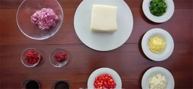 首先準備食材: 米豆腐 X 1塊(500g) 肉末 X 50g 蔥花,姜末,蒜末,小米椒碎 X 適量 泡辣椒,豆瓣醬,生抽,香醋,食鹽 X 適量(詳細用量請看內文)