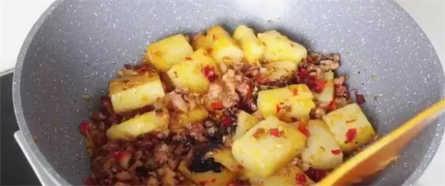 炒出紅油后,加入準備好的肉末,然后用鍋鏟適當的翻炒,炒至肉末散開轉色!肉末炒熟之后,加入切好的米豆腐,加入1湯匙的生抽,加入1茶匙的食鹽,加入1湯匙的香醋,然后翻炒均勻,讓所有的米豆腐都裹上色!等到米豆腐都裹上色之后,加入清水,清水的量沒過米豆腐即可,轉成大火煮沸,水煮沸后轉成中火燜煮20分鐘!煮得差不多的時候,準備一個小砂鍋,把砂鍋放煤氣爐里面,小火燒熱,約20分鐘,鍋里的湯汁所剩不多,砂鍋也燒熱了,這時就可以把炒鍋中的米豆腐全部轉移到砂鍋中!