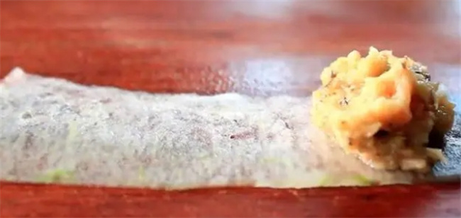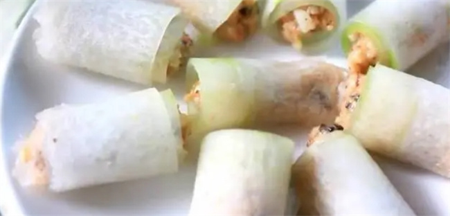 做好雞肉餡之后,把泡在鹽水里的冬瓜片用手稍微清洗一下,然后再用清水清洗干凈瀝干水分,把冬瓜片平鋪在菜板上面,然后用湯匙舀上適量的雞肉餡放在冬瓜片的邊上,然后用手從有雞肉餡的邊上把冬瓜片滾起來,讓雞肉餡包在冬瓜片里面!
