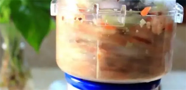 肌肉在腌制的過程中,我們把半根胡蘿卜切成絲,把2片大白菜切碎,把3朵鮮香菇也切成小塊,2朵木耳也切碎,切碎之后放到攪拌機上面,這時候把腌制好的雞肉也放到攪拌機上面,用攪拌機把這些食材都打碎,盡量打久一點,打得越碎越好!