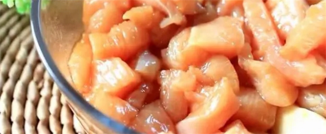 食材準備好之后我們處理食材:首先是冬瓜,用刮皮刀去皮之后,然后用削皮刀把冬瓜削成長條的薄片,然后準備一個較大的容器,加入適量清水,加入2湯匙的食鹽,攪拌均勻,再把削成薄片的冬瓜片放鹽水里面泡一會先!處理好冬瓜后,我們把雞胸肉切成1厘米左右大小的肉丁,然后加入1茶匙食鹽,加入少許生抽,加入1湯匙的料酒,然后攪拌均勻腌制一會!