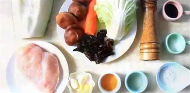 首先我們需要準備食材: 冬瓜 X 250g 雞胸肉 X 200g 鮮香菇,木耳,胡蘿卜,大白菜 X 適量 黑胡椒粉,生抽,料酒,食鹽,香油,淀粉,姜,蒜 X 適量