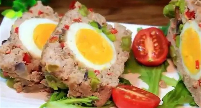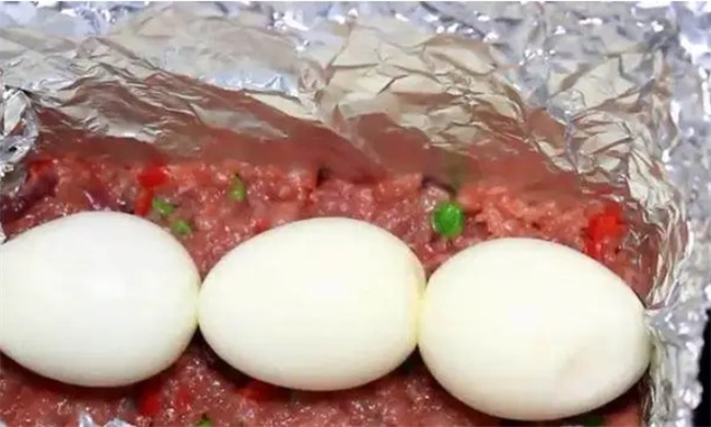 把食材處理好之后,煮的雞蛋應該也好了,放水里涼快一下把蛋殼給剝了。然后找個深長的烤盤,鋪上一層錫紙,然后把一般混合了食材的肉末倒到錫紙烤盤里面,再把剝了殼的雞蛋排列好放在肉末的中間,最后把剩下的肉末鋪在雞蛋的上層,把雞蛋包在肉末的中間,用湯匙稍微壓緊一下!