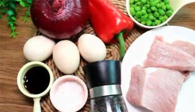 首先準備食材: 里脊肉(瘦肉) X 250g 洋蔥 X 1個 雞蛋 X 3個 豌豆 X 適量 甜椒 X 1個 生抽 X 1湯匙 食鹽 X 適量 黑胡椒粉 X 適量
